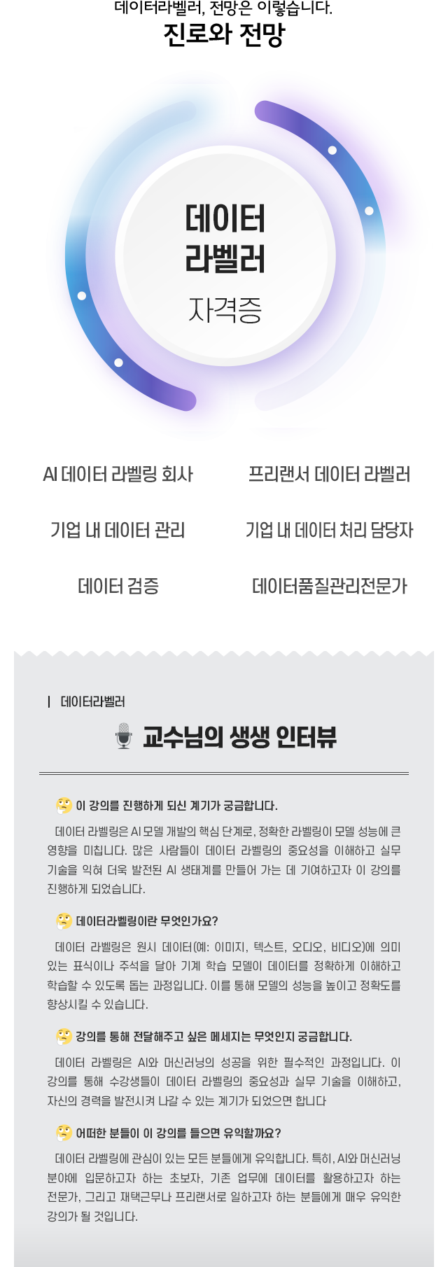 µ¥ÀÌÅÍ ¶óº§¸µÀÇ ±âÃÊ À̷кÎÅÍ °í±Þ ±â¹ý±îÁö Æø³Ð°Ô ÀÌÇØÇϰí, ´Ù¾çÇÑ ¶óº§¸µ Ç÷§ÆûÀ» ÅëÇÑ ½ÇÁúÀûÀÎ µ¥ÀÌÅÍ ¶óº§¸µ ½Ç½ÀÀ» ÅëÇØ µ¥ÀÌÅÍ °úÇÐ ¹× ÀΰøÁö´É ÇÁ·ÎÁ§Æ®¿¡¼ ÇʼöÀûÀÎ °íǰÁúÀÇ ÇнÀ µ¥ÀÌÅ͸¦ Á¦ÀÛÇÒ ¼ö ÀÖ´Â ´É·ÂÀ» °®Ãß´Â °ÍÀÌ´Ù. ¶ÇÇÑ, µ¥ÀÌÅÍ ¶óº§·¯·Î¼ÀÇ °æ·ÂÀ» ½×°í, °ü·Ã ºÐ¾ß¿¡¼ Àü¹®°¡·Î¼ Ȱµ¿ÇÒ ¼ö ÀÖ´Â ±âÃʸ¦ ¸¶·ÃÇÏ´Â °ÍÀ» ¸ñÀûÀ¸·Î ÇÑ´Ù.