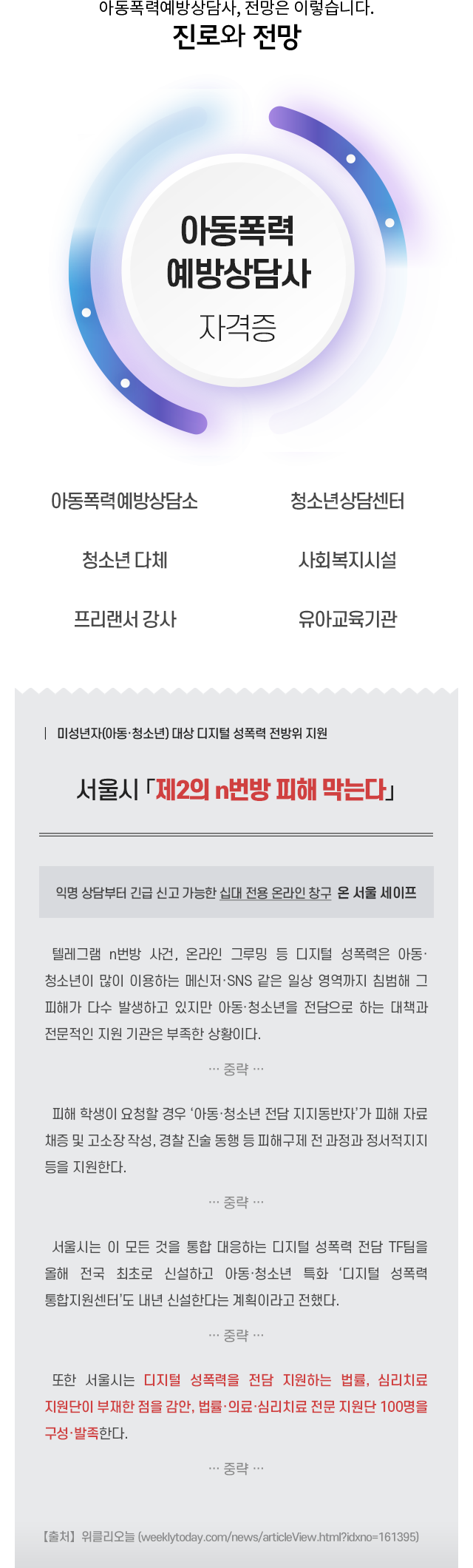 • ¾Æµ¿Æø·Â¿¹¹æ»ó´ã»ç Ȱµ¿À» À§ÇÑ ÀÚ°ÝÃëµæ°úÁ¤À» ÅëÇØ Çб³Æø·ÂÀÇ °³³äÀ̷аú Áö½ÄÀ» ½ÀµæÇϰí, ´Ù¾çÇÑ Áý´Ü»ó´ã ÇÁ·Î±×·¥À» ÅëÇÑ È°¿ë¹æ¹ýÀ» üµæ½ÃÄÑ ¾Æµ¿Æø·Â¿¹¹æ»ó´ã»ç·Î¼­ÀÇ ±âÃÊÀûÀÎ Á÷¹«¼öÇà ´É·ÂÀ» ¹è¾çÇÏ´Â °ÍÀ» ¸ñÇ¥·Î ÇÕ´Ï´Ù.