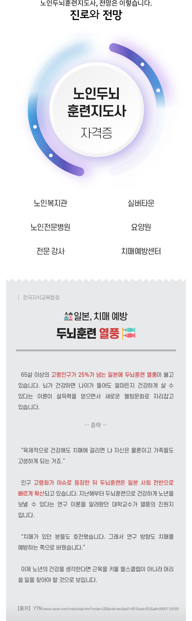 • ÀÌ·Ð Áß½ÉÀÇ ±³À°À» ¹ÙÅÁÀ¸·Î ´Ù³â°£ÀÇ ÇöÀå ±³À°À» ÅëÇØ üµæÇÑ ³ëÇϿ츦 ü°èÀûÀÎ ¹æ¹ýÀ¸·Î ±³À°Çϰí, ±×¸®±â, ¼ÕÀ¯Èñ¿Í °°Àº µÎ³úȰ¼ºÈ­ ±â¹ý°ú µÎ³ú°Ç°­Ã¼Á¶, ½Ç¹ö·¹Å©·¹ÀÌ¼Ç ±â¹ý ±×¸®°í ´Ù¾çÇÑ µÎ³úÀÎÁöÈÆ·Ã µîÀÇ ½Ç¹«ÀûÀÎ ¹æ¹ýÀ» ÀÍÇô µÎ³úÀÇ ¿µ¿ªÀ» °í·ç ÀÚ±ØÇÏ¿© µÎ³ú±â´É°ú ½Åü±â´ÉÀ» °­È­Çϰí ÁýÁß·Â, ±â¾ï·Â, ÀÎÁö´É·Â, Á¤¼­Á¶Àý´É·Â µîÀ» Çâ»ó½ÃŰ´Â ¹æ¹ý¿¡ ´ëÇØ¼­ ÇнÀÇÏ°Ô µÊ. ¶ÇÇÑ Ä¡¸Å³ëÀÎÀÇ Æ¯¼º°ú ³ëÀÎÀÇ ½ÅüÀû ½É¸®Àû Ư¼ºÀ» ¹Ý¿µÇÑ ³ëÀΰǰ­ÀÇ ÀçȰÀ» À§ÇÑ ´Ù¾çÇÑ ÇнÀÀ» ÇÒ ¼ö ÀÖ´Â Àü¹®°¡ÀÇ Á÷¹«¼öÇàÀ» °æÇèÇÏ´Â °­ÀÇ·Î ÁøÇàµË´Ï´Ù.