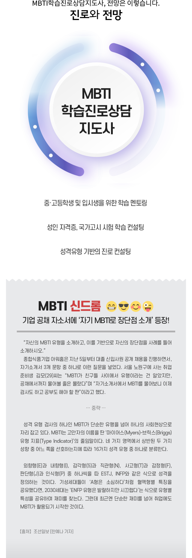 • MBTI ¼º°ÝÀ¯Çüº° ´Ù¸¥ ÇнÀ Àü·«À» ÀÌÇØÇϰí,À̸¦ Åä´ë·Î ³»´ãÀÚ¿¡°Ô ÀûÀýÇÑ ÇнÀ ¹× Áø·Î ÄÁ¼³ÆÃÀ» ÇÕ´Ï´Ù.