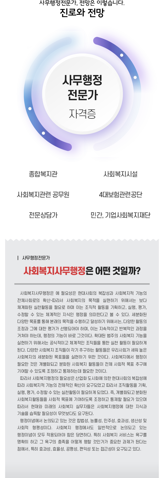 • »ç¹«ÇàÁ¤Àü¹®°¡´Â ÇàÁ¤¾÷¹«¿¡ ´ëÇÑ Áö½Ä ½ÀµæÀ» ÅëÇØ ÇàÁ¤ ½Ç¹« ¾÷¹«¸¦ ¿Ã¹Ù¸£°Ô ó¸®ÇÏ°í ¾È³»ÇÒ ¼ö ÀÖµµ·Ï ÇÕ´Ï´Ù.