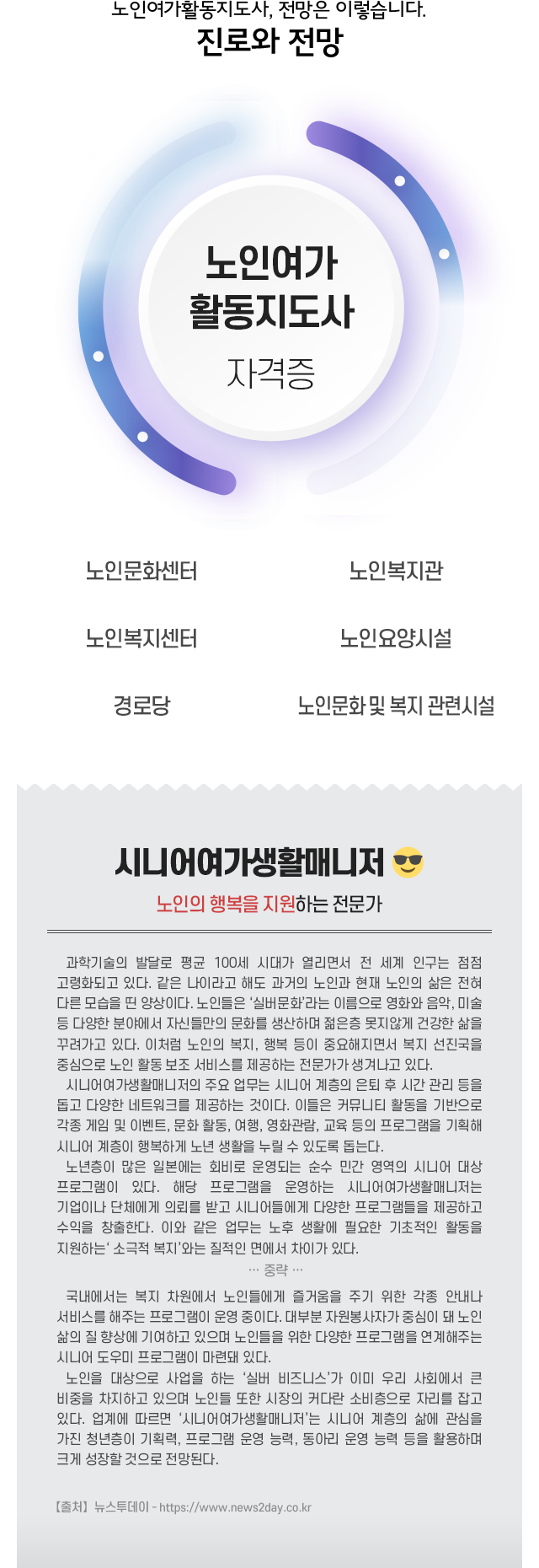 • ³ëÀο©°¡È°µ¿Áöµµ¿¡ ÇÊ¿äÇÑ Áö½Ä ¹× Ȱ¿ë´É·ÂÀ» ½ÀµæÇÏ¿© ³ëÀÎ °ü·Ã ±â°üÀÇ ¾î¸£½Åµé¿¡°Ô °Ç°­Çϰí ÇູÇÑ ³ëÈÄ »ýȰÀ» À§ÇØ ·¹Å©¸®¿¡À̼ǰú ¿ôÀ½Áöµµ ÇÁ·Î±×·¥À» °³¹ß ¹× Á¦°øÇÏ¿© ³ëÀεéÀÇ °Ç°­ÇÑ ³ëÈÄ¿Í »îÀÇ ÁúÀ» Çâ»ó½ÃŰ´Â Á÷¹«¸¦ ¼öÇàÇÒ ¼ö ÀÖµµ·Ï ÇÑ´Ù.